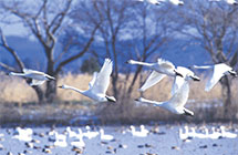 白鳥の渡来地として全国的に有名で、ラムサール条約登録湿地でもある「瓢湖」。昭和29年、日本で初めて野生の白鳥の餌付けに成功し、その後、国の天然記念物に指定されました。白鳥は毎年10月~3月上旬まで訪れ、11月中旬ころのピーク時には5,000羽を超える白鳥が見られることもあります。