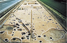 東西330メートル以上、南北280メートル以上の環濠集落遺跡です。大きな濠(環濠)が特徴で、内部から多くの建物跡や銅剣、盾、弓、石剣、石鏃(せきぞく)などの武器、武具が多量に出土しています。