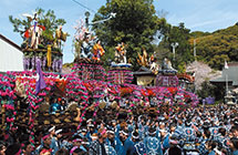 見どころは、神輿の渡御と13台の祢里(ねり)の曳き廻しです。「シタッ!シタッ!」の掛け声とともに町中を威勢よく曳き廻される祢里の華麗な姿に引き込まれます。