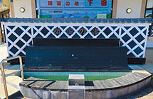 伊豆急下田駅前の広場にできた足湯。下田らしいなまこ壁を用いたデザインになっています。ヒノキの椅子に座りながら、のんびり浸かることができます。