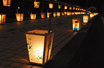 旧暦の七夕に、牟岐川をまたぐ大川橋の歩道上に、牟岐小の児童や住民が制作した作品が並び、昔ながらの幻想的な街並みが広がります。
