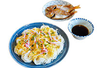 出羽島の郷土料理。島そうめんは、一般的なそうめんとは違い、出羽島で獲れたれんこ鯛の煮付けを作った際の煮汁をめんつゆに使用するアイデア商品です。
