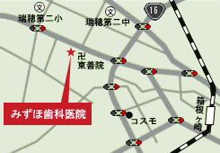 青梅街道近くにある、アクセスの便利なみずほ歯科医院は、ミントグリーンの文字もさわやかな看板が目印です。地元でも小さなお子様からご年配の方まで、アットホームな雰囲気が通いやすいと人気の歯科医院です。当院の6~7名のスタッフは、ご来院される患者さんとのコミュニケーションを大切に、安心して治療を受けていただけるように心がけておりますので何でもご相談ください。虫歯をはじめ、歯ぐきのこと、入れ歯や差し歯、歯周病、口内炎など歯のことで困ったら、お気軽に当医院へご来院ください。