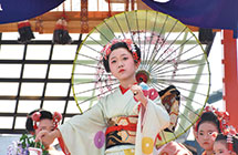 多くの引き手たちが引く華やかな山車の上で、踊り手たちが優雅に舞います。山車の提灯が照らす舞台は幻想的。踊り手の舞はもちろんですが、温泉街や坂道を通る際、大きな山車を巧みに操る引き手たちの技術は必見です。